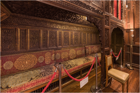 The banquettes were originally created for the Colonial & Indian Exhibition held in South Kensington, London, in 1886. After the Exhibition, the banquettes were re-upholstered by Lord and Lady Brassey, when the Hall was moved to their Park Lane mansion. The material they used was bought in Cairo by Annie Brassey on one of her early trips. The embroidered patterns include random Arabic letters set within stylized cartouches and bordered with foliate and graphic motifs. The designs are made from panels of silk and richly embroidered with metallic threads.