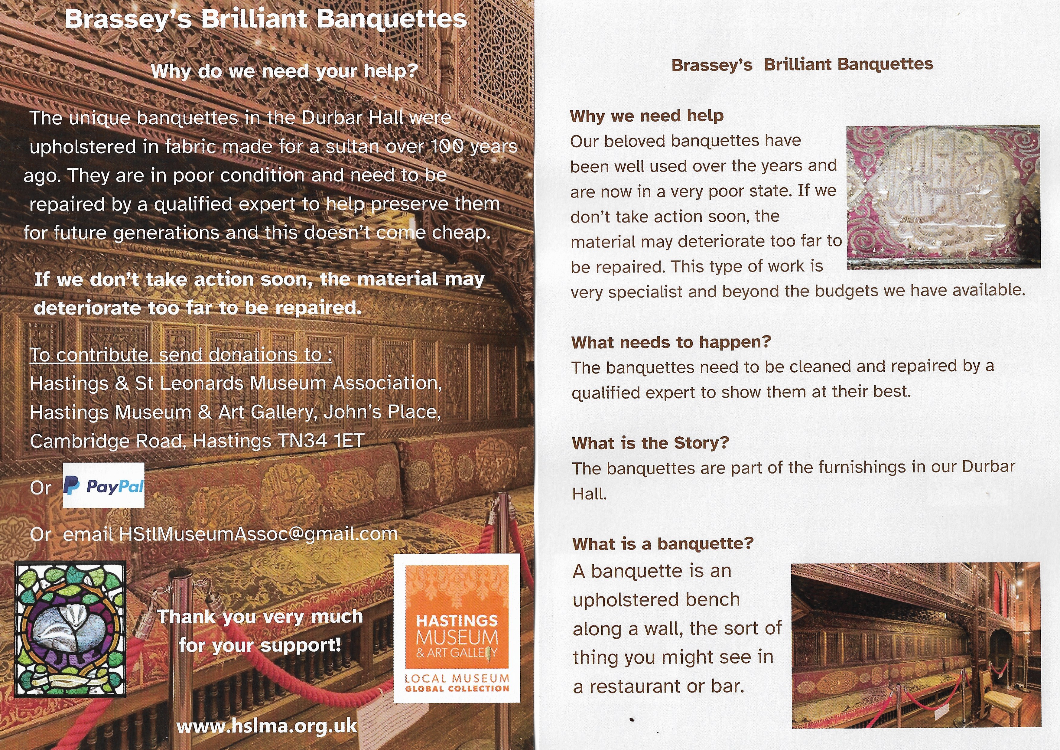 We are, therefore, inviting you to donate as generously as you can to raise funds to pay for this work. By helping to fund this conservation work, you will be helping the museum to preserve a rare example of craftwork of this kind as well as an important part of the Durbar Hall furnishings in their original condition.
