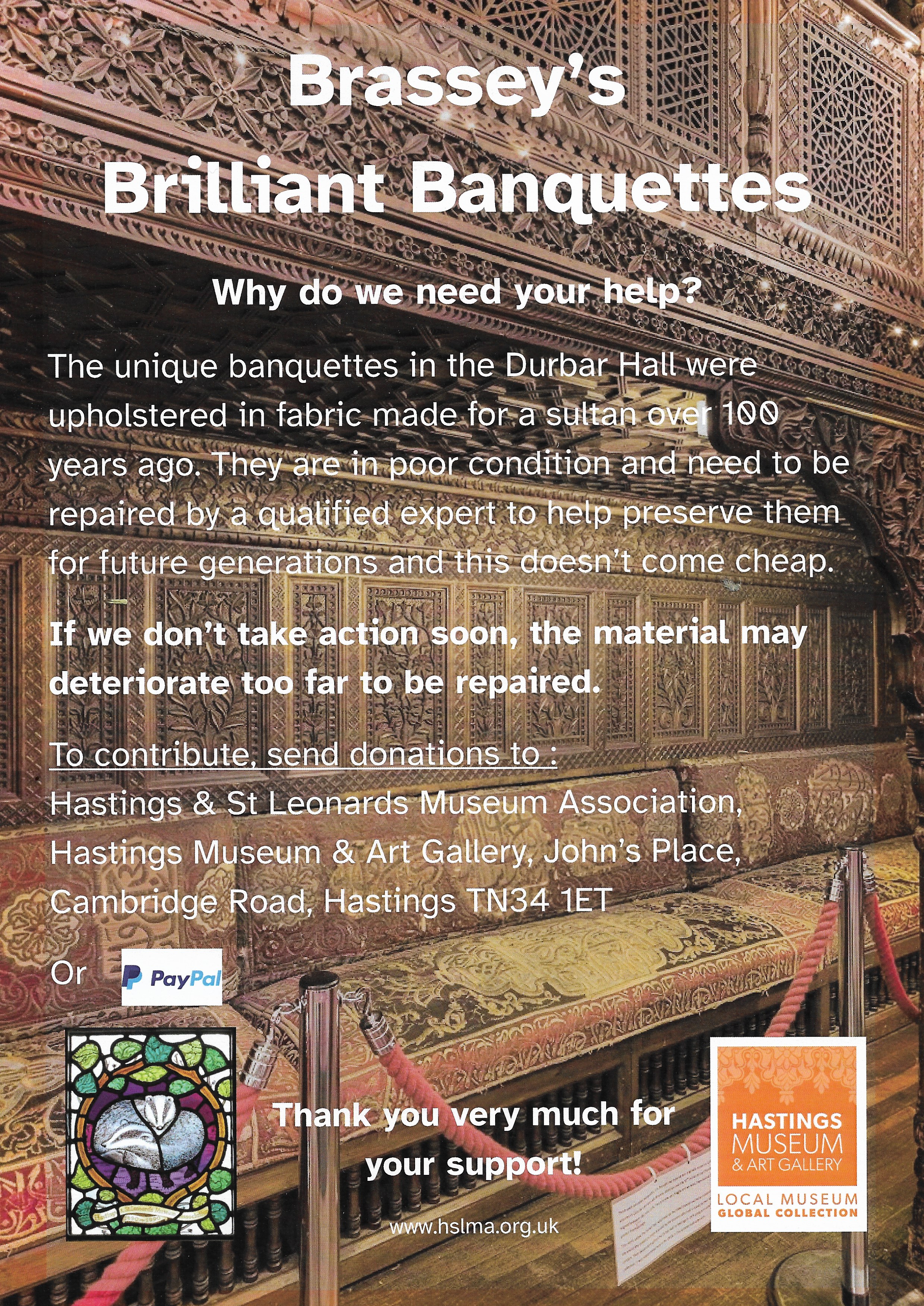 We are, therefore, inviting you to donate as generously as you can to raise funds to pay for this work. By helping to fund this conservation work, you will be helping the museum to preserve a rare example of craftwork of this kind as well as an important part of the Durbar Hall furnishings in their original condition.